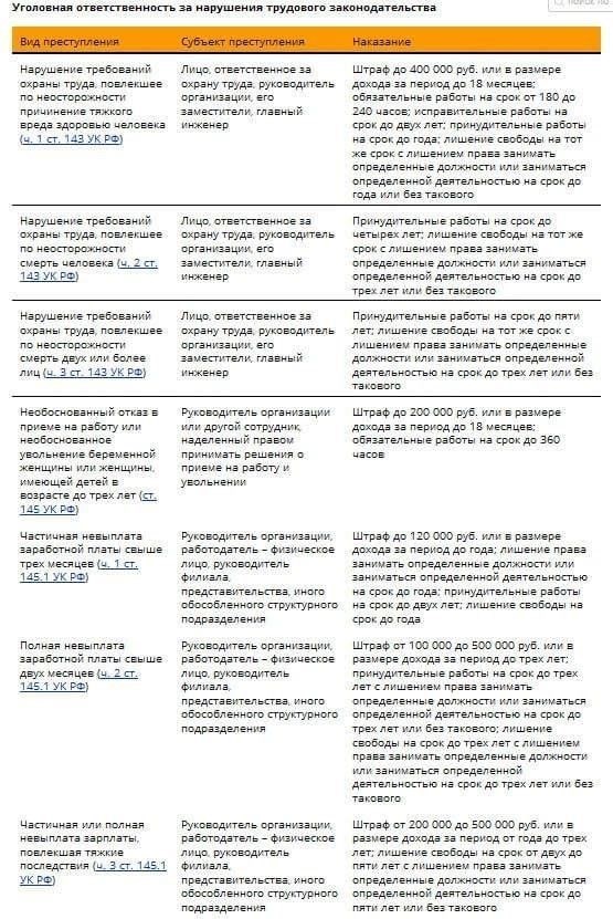 - Ответственность за нарушения: Работодатели, нарушившие эти правила, могут быть привлечены к уголовной ответственности. Такие действия, как принуждение сотрудников к работе в небезопасных условиях, оплата труда ниже минимального уровня или дискриминация по половому признаку, могут привести к штрафу или тюремному заключению.